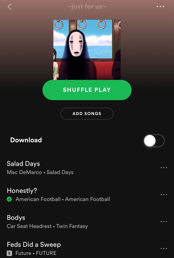 Add an all lowercase title with random symbols like “~just for us~”, add a frame from any Studio Ghibli movie as the picture for it and you have a perfect playlist that you will either never listen to after 4 days or will cry about every time you see her making a collab playlist with another dude.